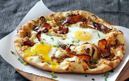 With slices potatoes, bacon, ham, sausage, eggs & mozzarella.